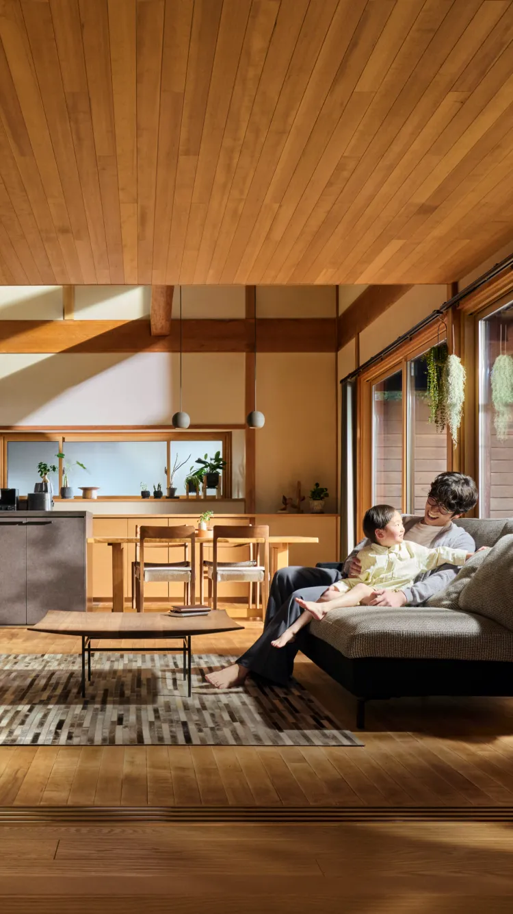 木の暮らしは、いにしえから続くこの国の文化。 天然木は使うほどに風合いが増し、 木の家には、日々の営みの温かな記憶が ゆっくりと刻まれていきます。 生きている木の自然の息吹を、暮らしの中へ。