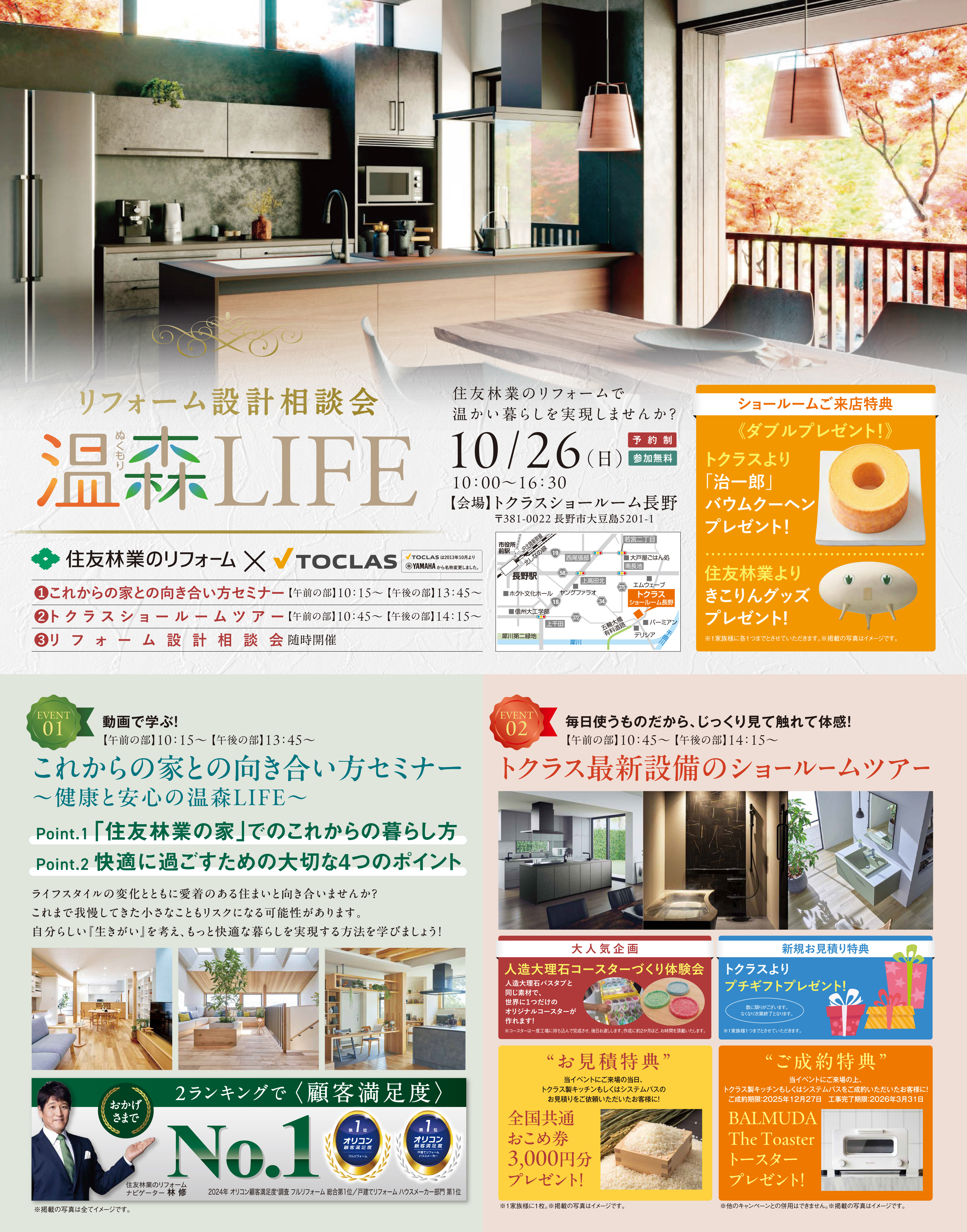 「住友林業の家」オーナーの皆様へ、「リフォーム設計相談会『温森LIFE』inTOCLAS」のご案内