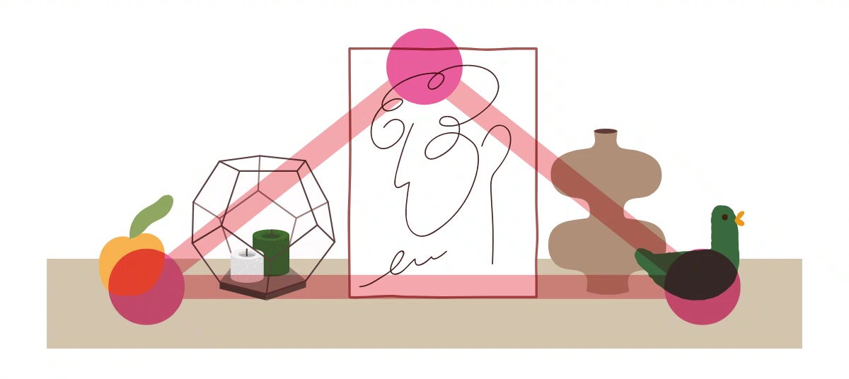 アートや小物類などは、思い切ったカラーやデザインでも空間に個性をつけるポイントになります。アートを壁にかけるなら照明で照らすと目線をより引き付けるスポットになるのでオススメです。カウンターや背の低いカップボードにディスプレイするなら、「三角形」を意識するのがコツ。大きなアイテムを中心に置き、小物はサイドに並べると互いに引き立て合います。仕上げにちょっと離れたところから全体のバランスを確認して、わが家ならではの風景を演出しましょう。