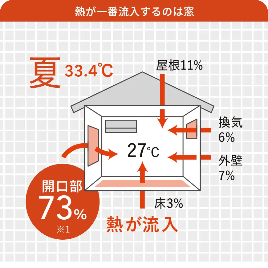 夏の間、エアコンをつけても部屋がなかなか涼しくならない、とお悩みの方も多いのではないでしょうか?夏は、冷房をかけていても暑さが部屋の中へ自然に流入しており、そのうちの約7割が窓などの開口部からといわれています。そのため、室内を快適にするには、まず窓から侵入する熱を抑えることが重要です。
