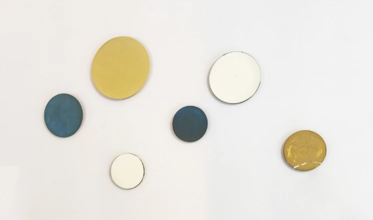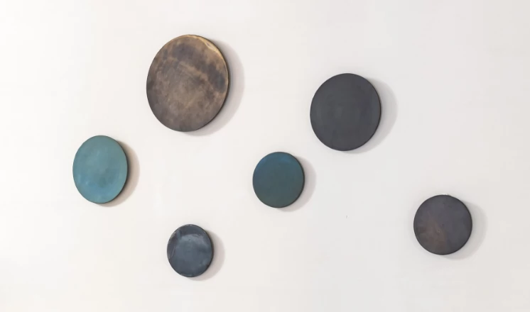 交趾(こうち)と呼ばれる色鮮やかでつやのある釉薬を使い、円が重なりながら連なる七宝模様と菱を組み合わせた精緻な模様を描き出す、京焼・清水焼ならではの陶器。この伝統技法を駆使しながら、6枚1セットのプレートアートに仕立てました。一つひとつ微妙に色合いが変化し、マットな表情を生む釉薬を採用しているため、しっとりとした手触りに。大小をつけた丸いフォルムが、暮らしに温かみとやわらかさを添えます。