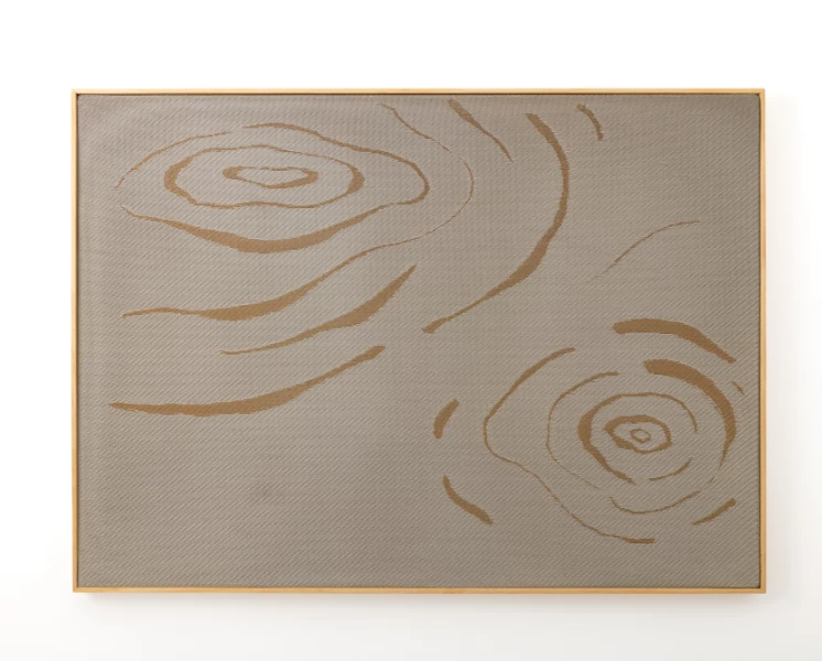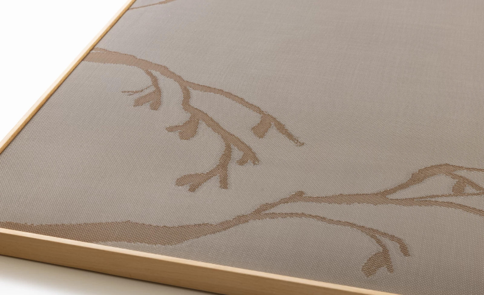 西陣の織物技術を活かし、極細のワイヤーで織り上げられる金属線織物は、国内外から注目を集める技術。ワイヤー織ならではの落ち着きのある光沢と、光を受けて生み出す多彩な表情が魅力です。このワイヤー織をアートパネルに。マットな質感と軽やかな透け感をあわせ持ち、柔和な雰囲気を漂わせます。見る方の感性や配置場所によって、天地や縦横を替えて飾れるのも特徴。窓との位置関係や照明に応じて刻々と変わる趣を楽しめます。