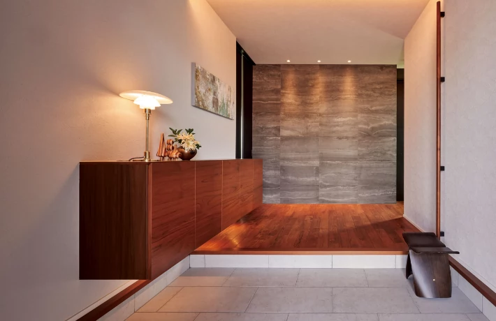 空間を壁や家具で仕切らなくとも、スタンドライトの光で明暗の差をつけると、深みや奥行き感が生まれ、コーナーとしての演出ができます。ソファ横に配置すれば、読書や書き物などの手元のあかりとしてだけでなく、ソファまわりを居心地のよい雰囲気に。また、単調になりがちな玄関まわりも、スタンドライトを配置するだけで空間に変化がつき、やわらかく広がる光が落ち着いた印象をもたらします。