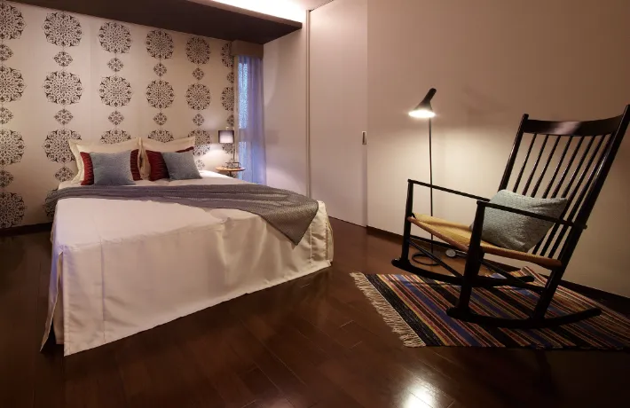 スタンドライトは、サイズや光の広がり方もデザインによってそれぞれ異なります。空間を広く見せたいときには、天井や壁の高い位置を照らすタイプがオススメ。光が天井を高く見せ、広がりを感じさせます。一方、落ち着いた雰囲気の空間としたい場合には、床面に光が広がり、低い位置で光を強調するタイプが適しています。また、入り口から対角線上にスタンドライトを配置すると、目が自然と奥へ引きつけられ、空間全体を広く見せる効果があります。