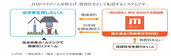 移住・住みかえを希望する50歳以上の方を対象にマイホームをJTIが借り上げ、第3者に転貸する仕組み。最長で終身にわたって借上げて転貸し、安定した賃料収入を保証する制度。これにより自宅を売却することなく、住みかえや老後の資金として活用することが可能となる。