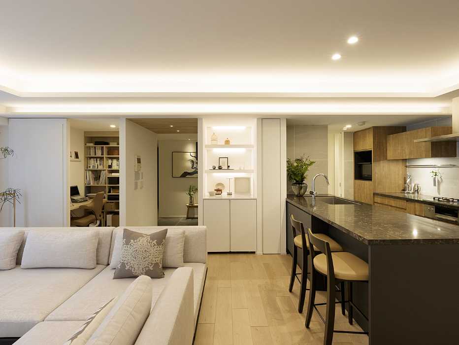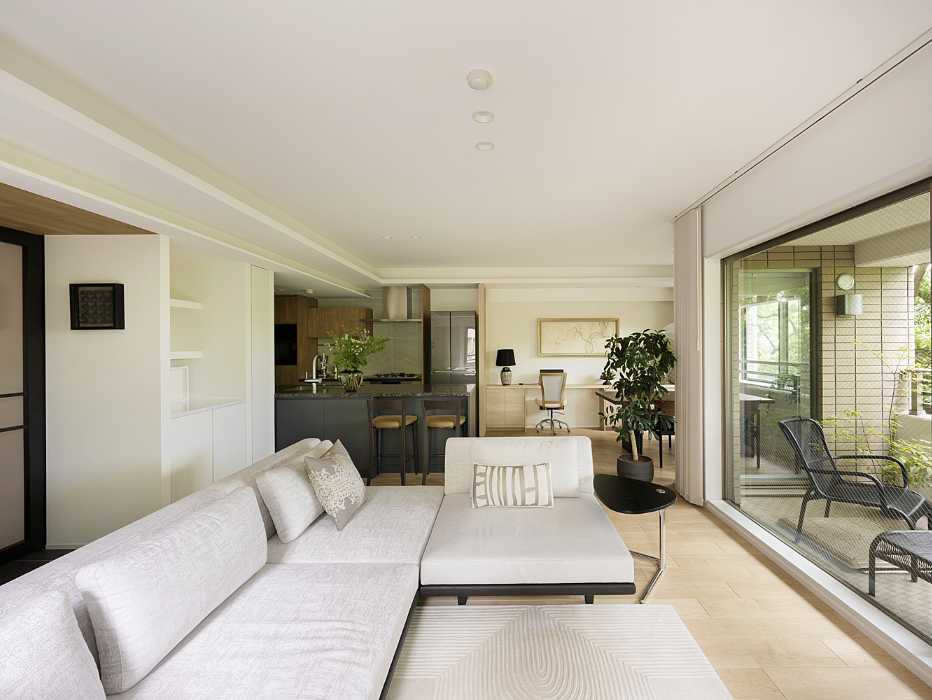 リビングを別の角度から。ソファコーナーはもちろん、ダイニング、バルコニー、キッチンと、一つの空間に居心地の良い場所がたくさん生まれました。やわらかな明かりを灯す、間接照明の配置にも工夫を凝らしています。