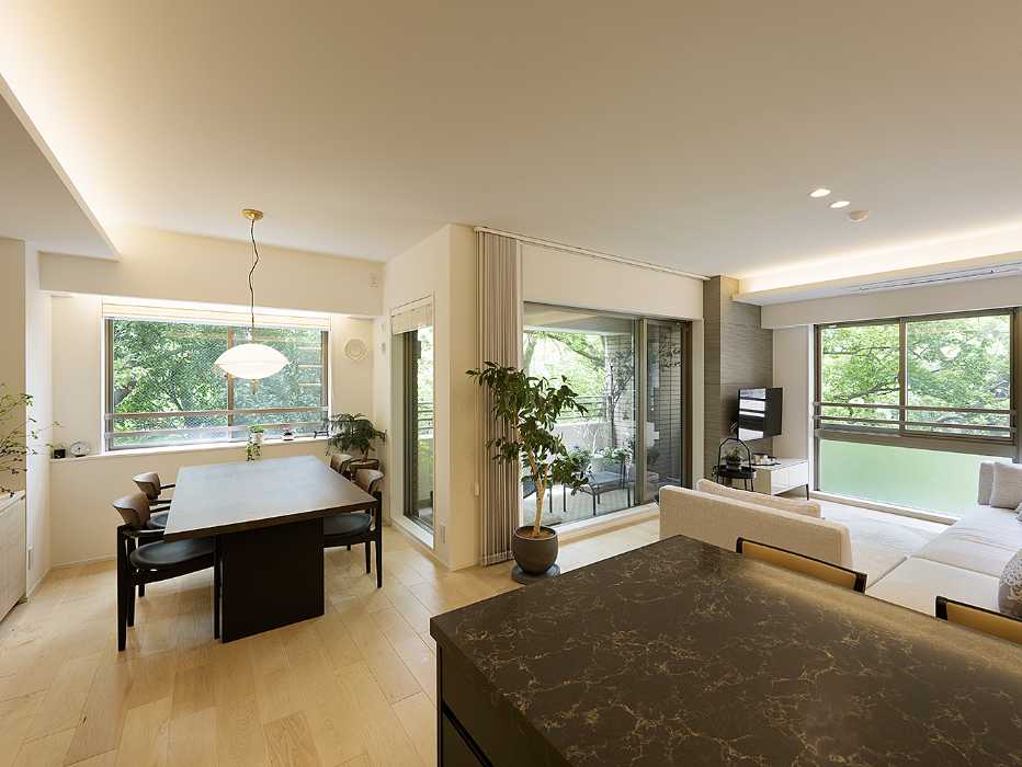 中古マンションの購入を機に、フルリフォームを行ったお住まい。緑豊かなロケーションをどこにいても楽しめるようにと計画したリビングは、床材にやさしい色合いのメイプルをセレクト。壁紙やインテリアとともに明るい雰囲気を醸し出しています。