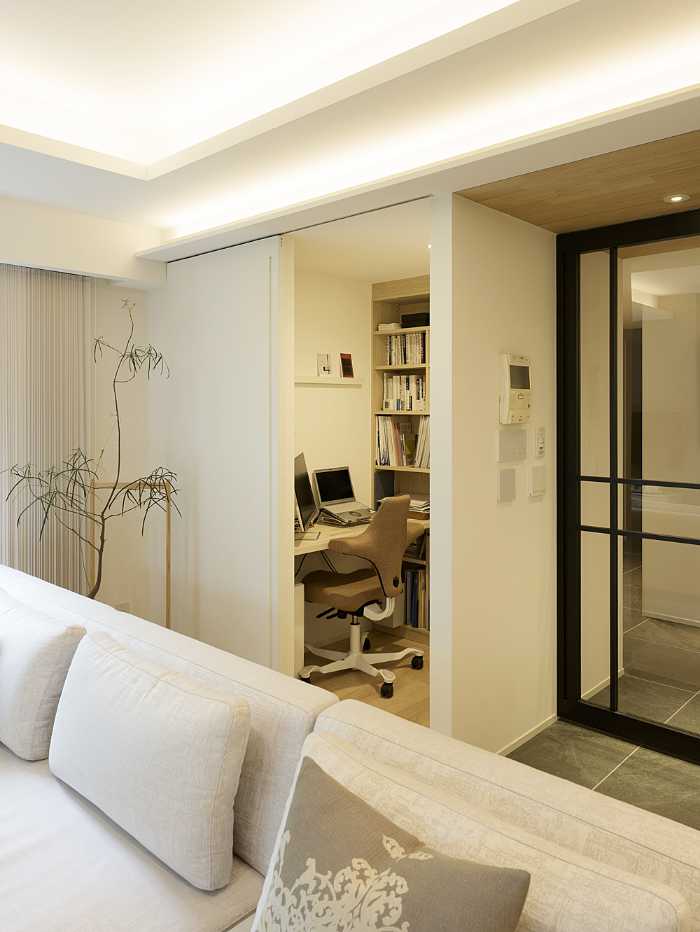ソファコーナーの後ろに新たに造作したのは、奥さまの書斎です。1.3メートル四方とコンパクトなスペースながら、デスクカウンターとオープンシェルフを備え付け、機能性は十分です。