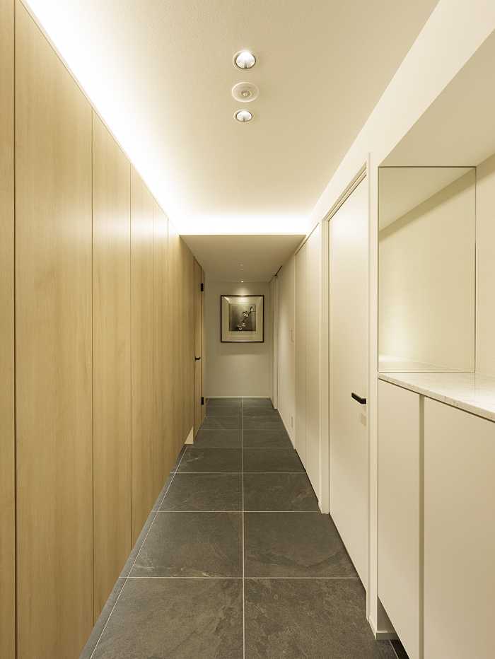 エントランスからまっすぐ伸びるホールには、イタリア製タイルを敷き詰めました。浮遊感あるクロゼットの扉はフラットタッチタイプ。空間全体が洗練されたデザインのようです。正面の壁をはじめ、お住まいには奥さまの絵画コレクションが飾られる予定です。