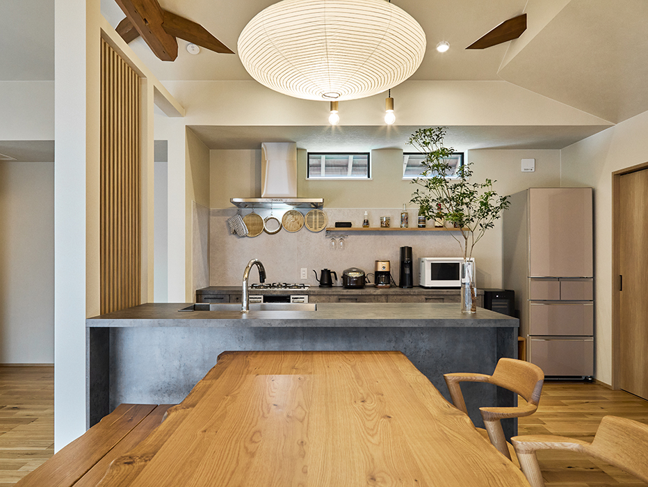 天井の高さを活かして隠れていた梁を現し、床や天井は温かみと大らかさのあるオーク材をふんだんに使用しました。料理好きのご夫婦一緒に作業できるよう、コンロとシンクを分けた2列型キッチンを採用。「広く清潔感があり、使い勝手が良く、暮らしの質が上がりました」と奥さまは笑顔で話します。