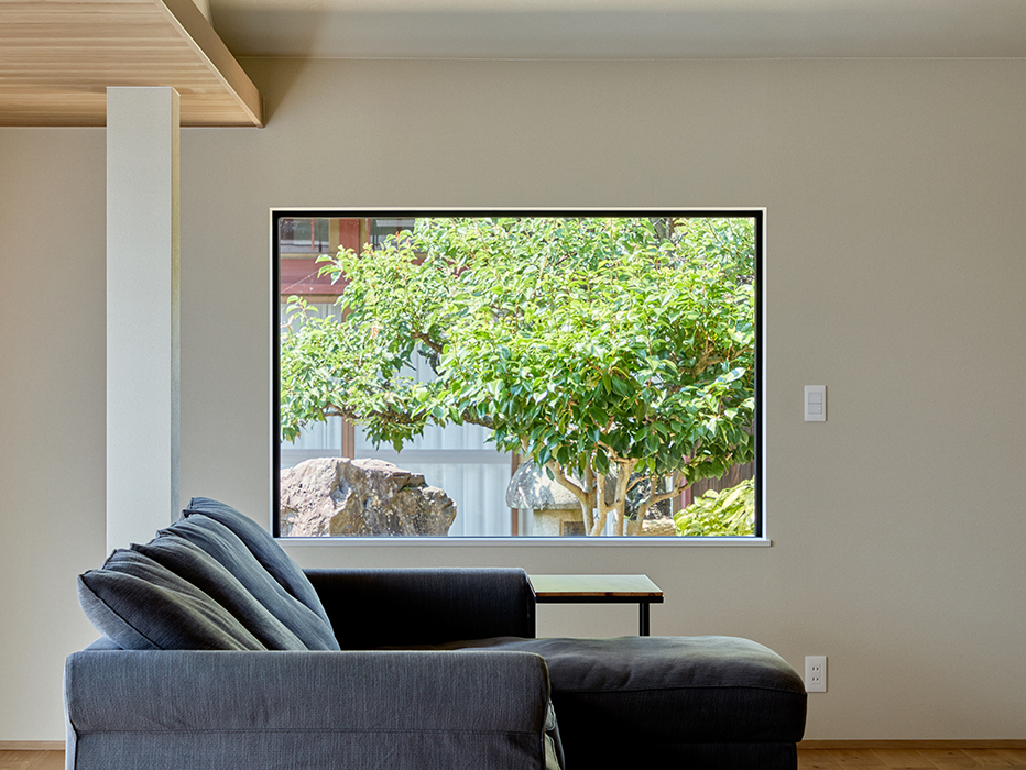 祖父の代から手入れされていた庭に元々あった立派な植栽や庭石をソファから望めるように工夫したLDKは、まるで額縁で縁取られた美しい絵のように、四季の移ろいを心ゆくまで楽しめる寛ぎの空間となりました。