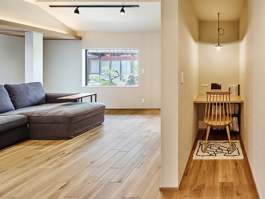 LDKの隅には、家事の合間に読書やちょっとした作業もできるようにとご提案し、奥さま専用のミニワークスペースを配置しました。また、物置だったスペースはご主人の書斎に変更し、開放感のある中にも快適なプライベート空間もしっかりと確保しました。