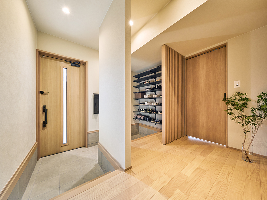 大収納のシューズクロゼットは、間仕切りによって玄関と切り離したことで、お客様の急な来客があっても生活感を見せることなくお迎えできます。適所に設置されたオーク材の格子スクリーンは、和モダンインテリアのアクセントにもなっています。