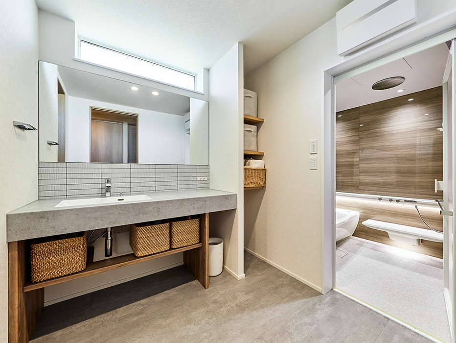 水まわりは洗濯後にすぐ衣類収納ができるようにゆとりのあるランドリールームとし、また、ウォークインクロゼットを行き来できるようにしています。ご主人が開放感と心地よさにこだわったバスルームには、肩湯が楽しめるTOTOのシンラを採用しました。