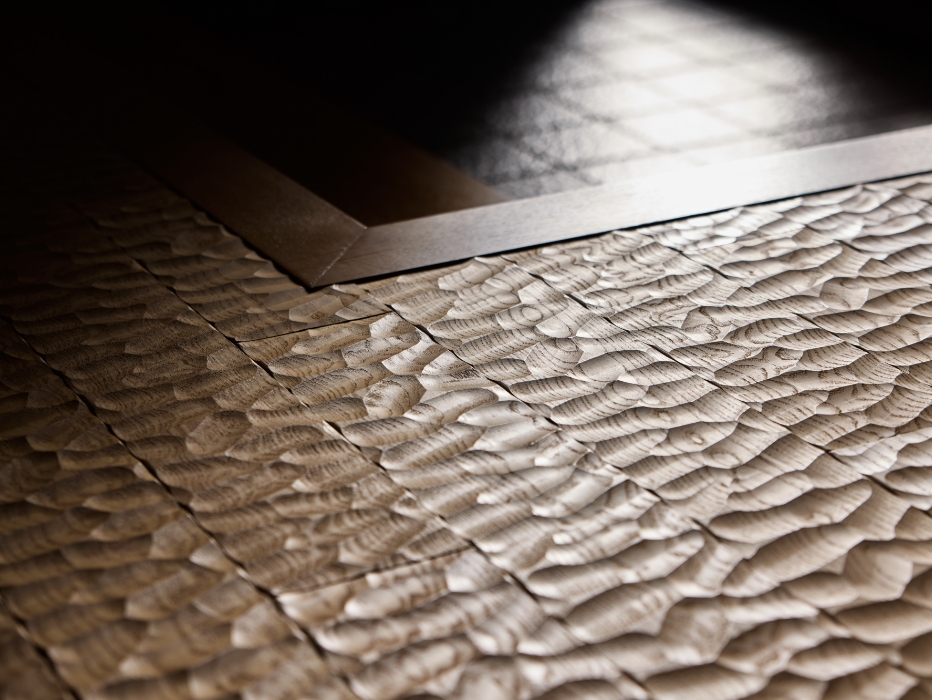 玄関の床材には、インテリアコーディネーターが住友林業グループオリジナルのスプーンカット加工の床材をご提案。陰影のある豊かな表情がプラスされ、ご主人さまの一番のお気に入り空間となりました。