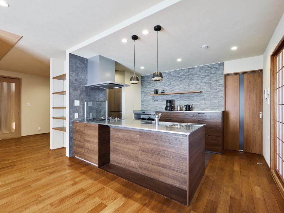 奥さまが最もこだわったキッチンは、調理中もご家族やお客さまと会話が弾むように独立型からセミオープン型へ変更しました。リビングのオーク床材との調和に配慮しながら、キッチンの床と壁は水や汚れに強く調湿機能のある石目柄タイルのエコカラットプラスを選びました。