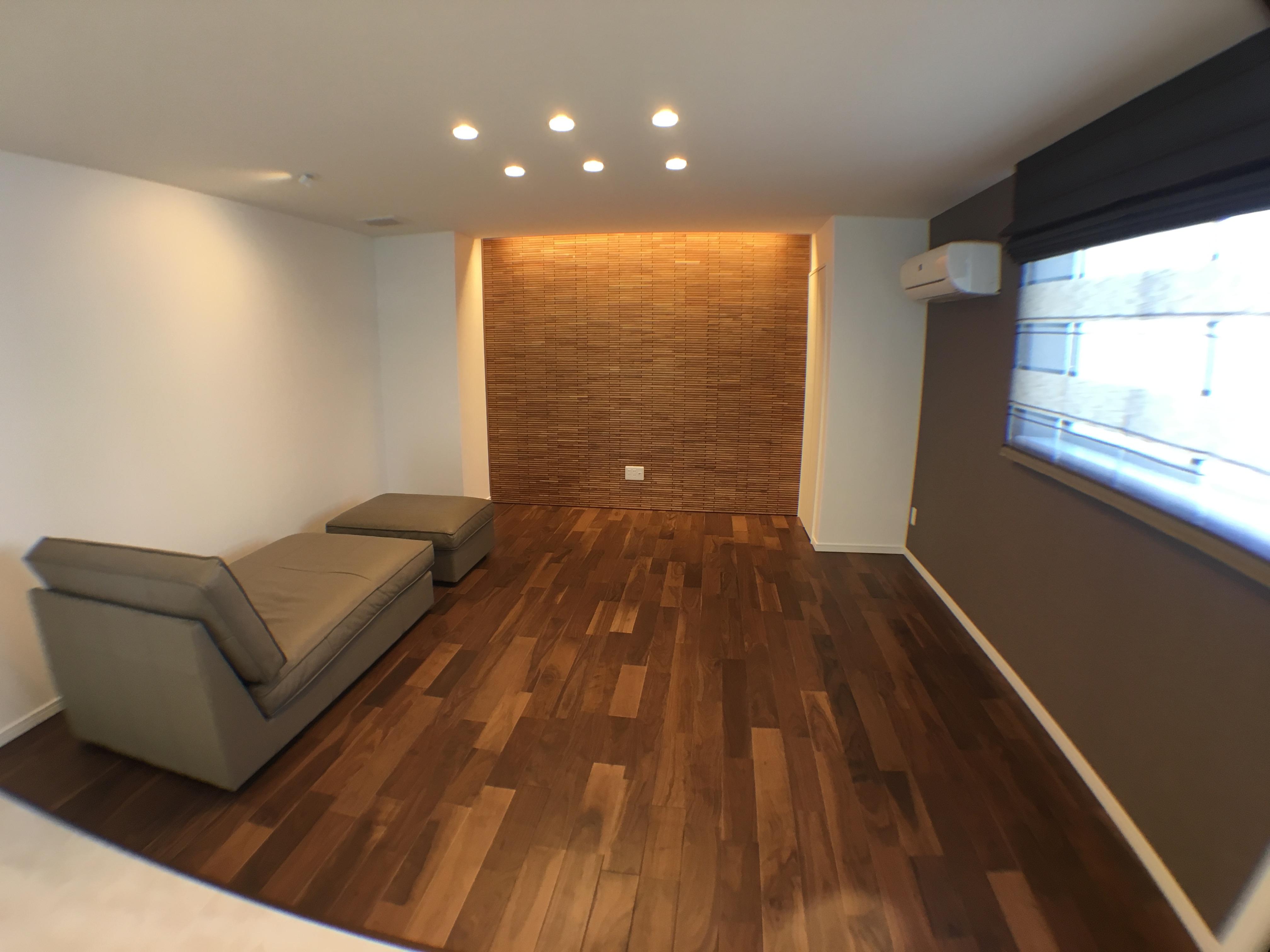 まずリビングには大人が惚れ込む高級ホテルなどに用いられる天然木挽板のウォルナットの床材を採用しました。