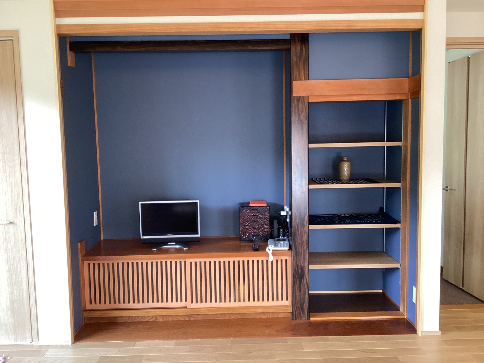 リビングは床柱、地袋を残し、元々使っていた収納棚を再利用するなど、和室の面影を残した内装になっています。
