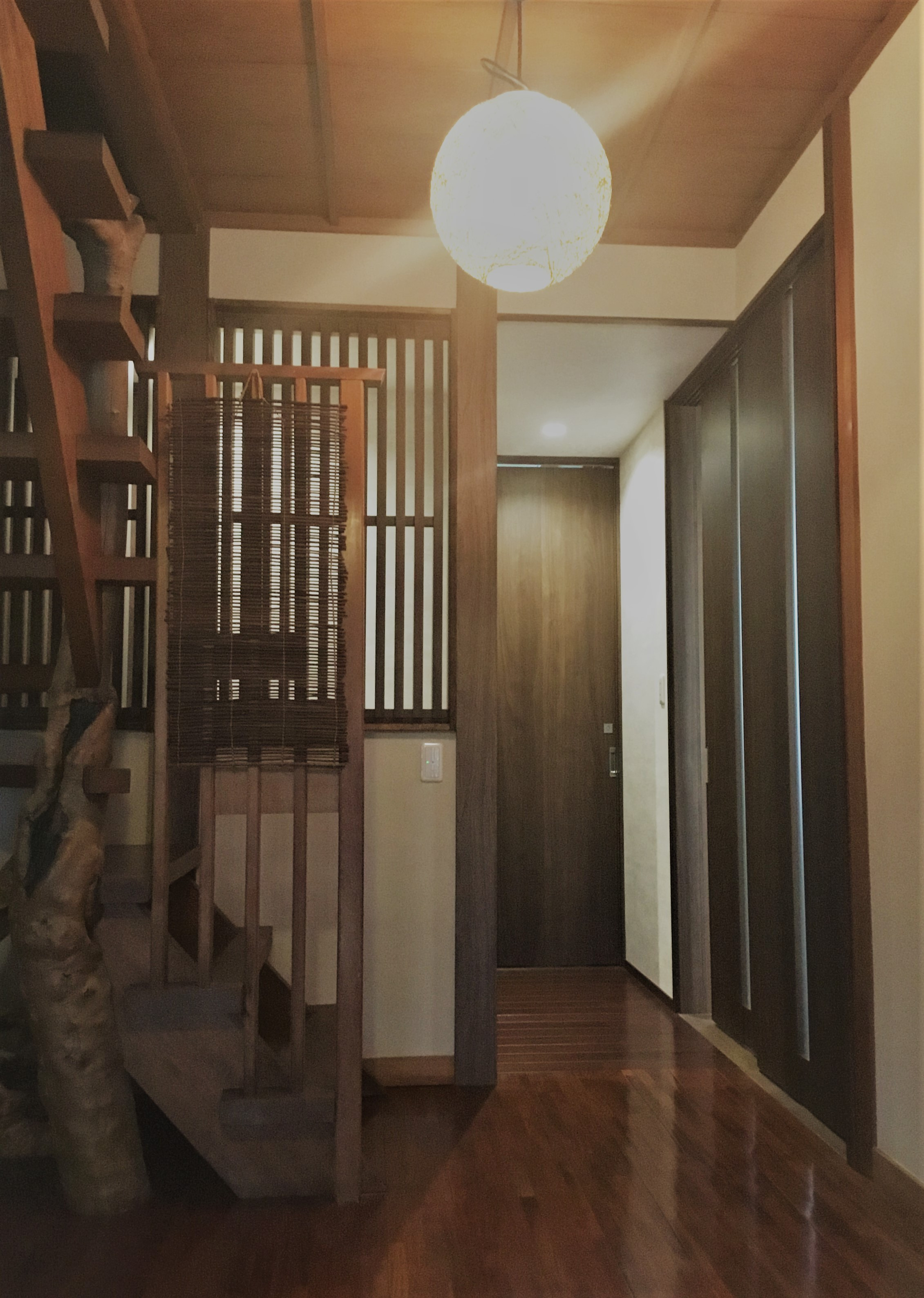以前の長い広縁の半分を土間スペースにし、階段を設け、玄関から直接奥の和室に行けるようにしています。